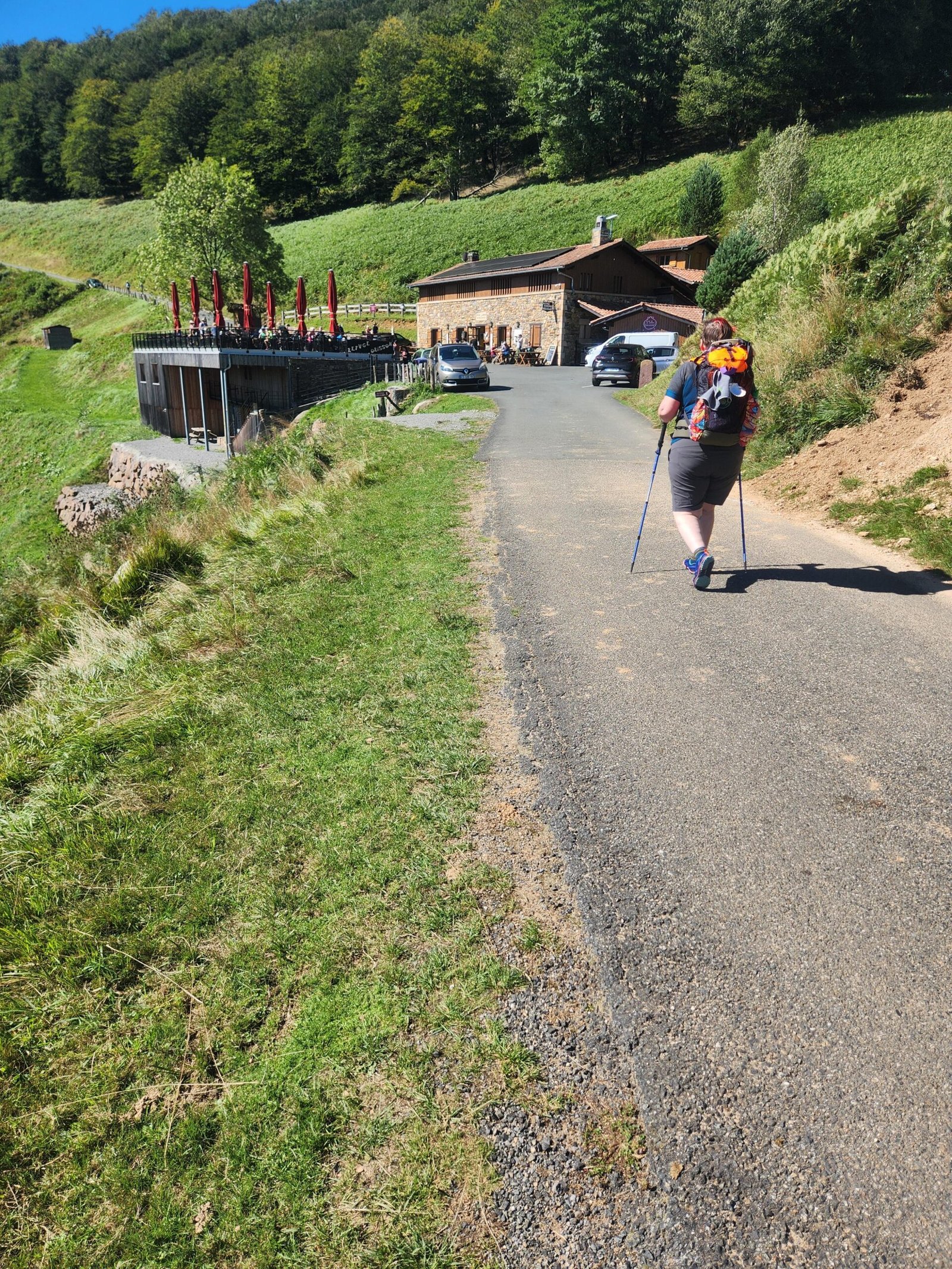 We woke up to a Gregorian chant at 6ish, and had to be up and packed and out the door for 8. Breakfast was lovely, toast with ham and cheese, butter, jam, nice coffee and fresh orange juice, an apple, and a dessert. On to the walking. We only went for about 5km to a little town called Burguete-Auritz, and we tried to get a room but were turned away a couple of times before the third place asked us to come back for check-in at 2. It was about 11. There wasn’t much to do but wander and look at the buildings. We had coffee and a pastry at a little breakfast place.