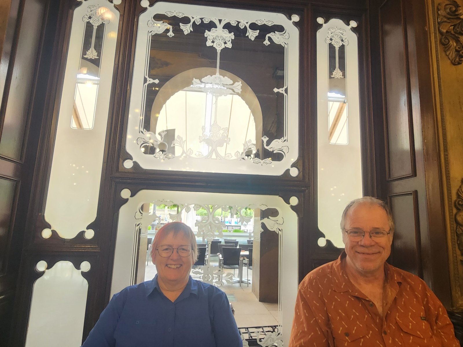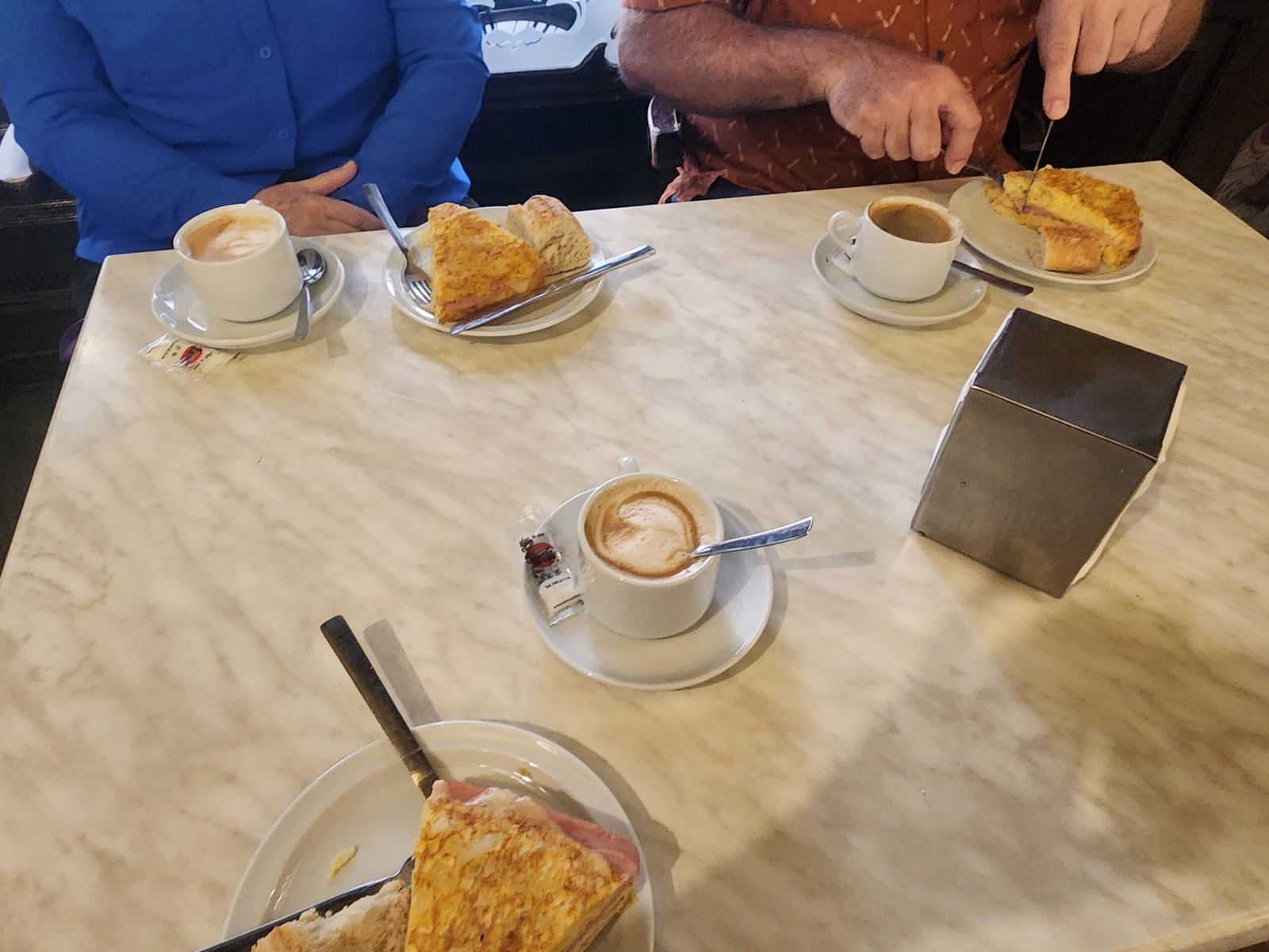 We came into Pamplona and went for our room. This one is in a newer area of the city, and it’s a bit far from the sights. No matter, we took a bus today. Got into Plaza del Castillo in the morning, and we ate breakfast and coffee at the Cafe Iruña. Pictures attached. We had a slice of torta, an omelette/tart with egg and potato and this one had ham and cheese in the middle. So delicious! The inside of the building is incredible with its wood moldings and details. Apparently the first bar to have electric lighting in the city. It was opened in 1888 and was a frequent haunt of Ernest Hemingway.We walked over to the Hotel la Perla in the corner of the square, where Hemingway stayed. We looked in the windows, because it felt like we weren’t dressed for the lobby. Also, there was a man who drove up in an Aston Martin coupe right outside the door. Didn’t know you could do that!
